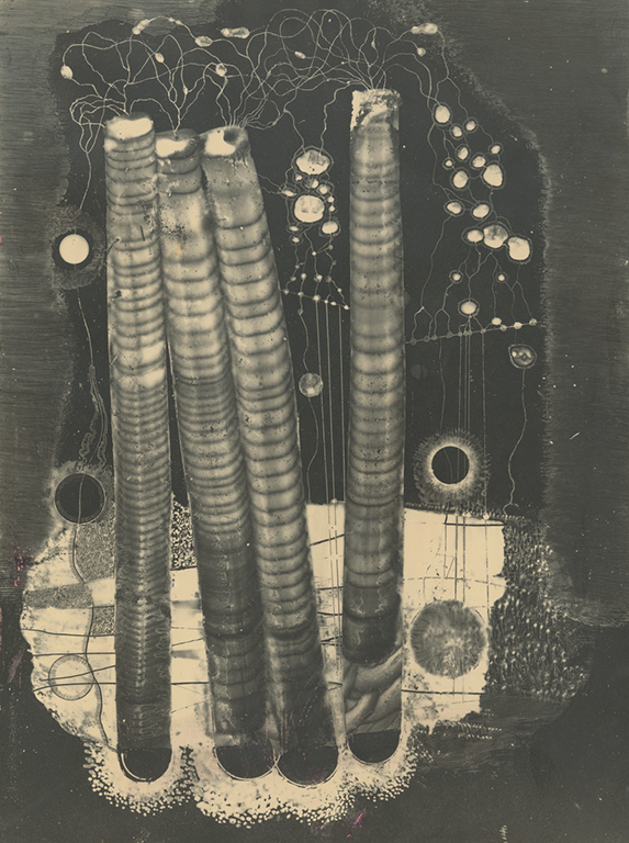 Face aux mystères de la matière, observés et documentés dans divers domaines scientifiques et en microphotographie, il est difficile pour un artiste contemporain de résister à l'envie d'intégrer ces phénomènes à sa création artistique consciente. Ce vaste champ d'exploration sera sans aucun doute enrichi par les générations futures d'artistes. À ce propos, je souhaite simplement attirer l'attention sur certaines possibilités offertes par l'héliographie, accessibles grâce à des conditions issues de la physique et de la chimie. Dans mes expérimentations, j'ai été guidé par l'idée qu'au lieu de reproduire des phénomènes visuels naturels, je devais créer directement sur la pellicule les sources de leur création. Dans la nature, la présence et la dilution de la matière, sous forme de taches sombres et claires (selon le fond), résultent des mouvements ondulatoires de la lumière, du son, de l'électricité, du magnétisme et de la gravité. Des conditions similaires, existant dans la nature, peuvent être recréées sur pellicule par l'utilisation de l'électricité, le rejet mutuel de substances liquides non miscibles, l'émulsification de liquides près de la surface, la création de sédiments entre des substances chimiquement actives et l'inclinaison de la pellicule. L'idée est ici d'obliger la matière à prendre une direction prédéterminée afin d'exploiter le mouvement de ses molécules avant sa solidification sur le support. De cette manière, on peut aisément reconstituer la quasi-totalité des images plastiques des éléments naturels, toutes les formes végétales et les formes animales les plus simples. En appliquant des méthodes scientifiques, l'artiste peut considérablement élargir le champ des arts graphiques contemporains, à condition de s'affranchir des méthodes traditionnelles et de cesser de s'en remettre aveuglément au support et au tube de peinture à l'huile.