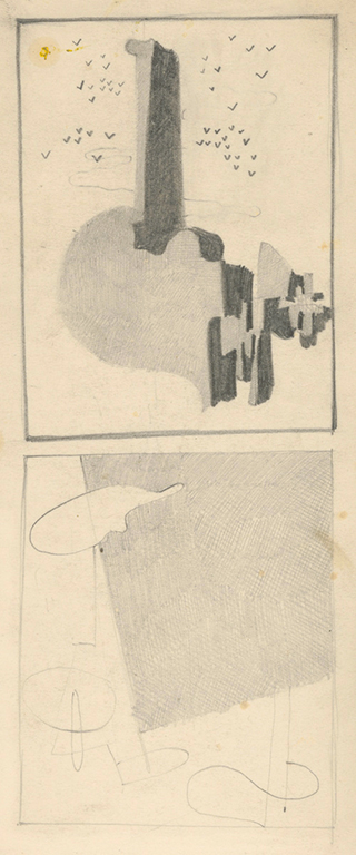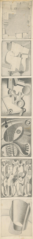 Primo. Tout commence par un dessin préparatoire dit « crayonné », esquisse ou croquis, dont la version finale est archivée sur une bandelette étroite simulant une bobine de film (voir ci-après les deux premières images des compositions XXV et XLV). Ses sujets s’insèrent le plus souvent dans des rectangles au format portrait avec des dimensions variables mais d’un rapport assez proche du nombre d’or. Le rendu graphique est soigné, précis, « chirurgical ».