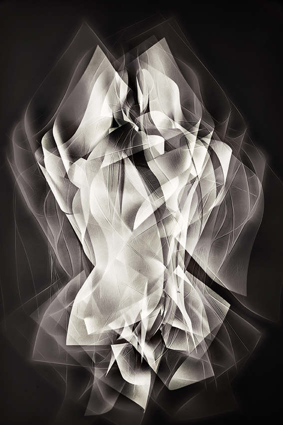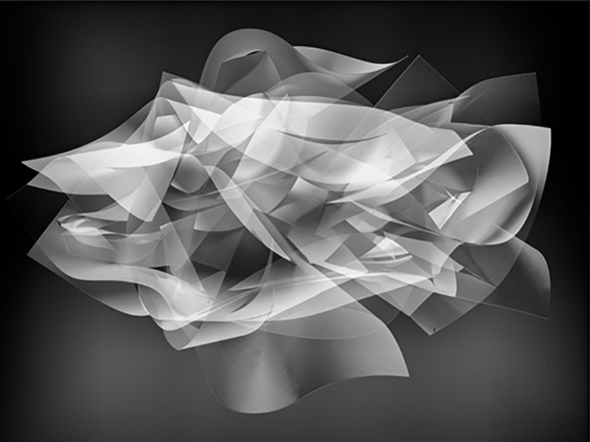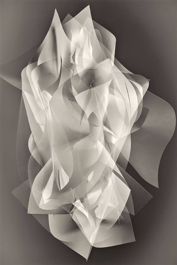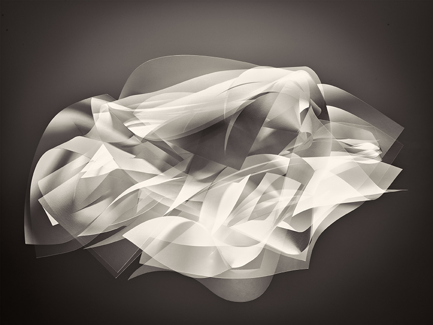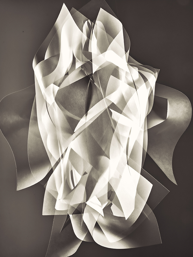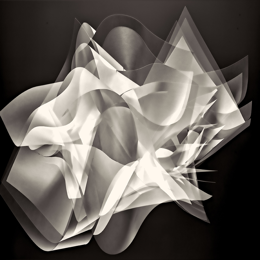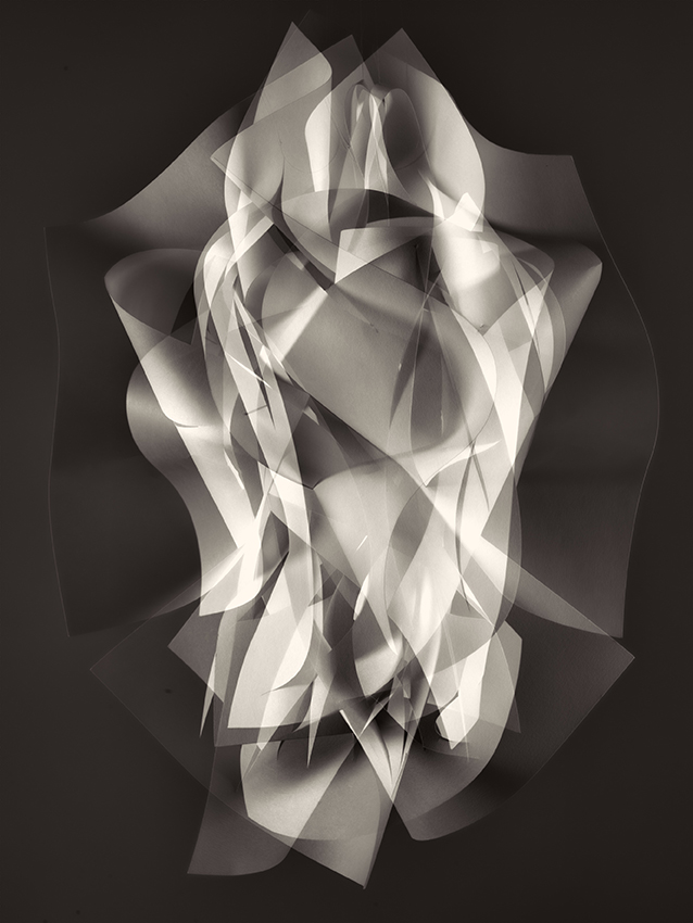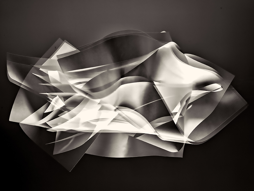 Francis Bruguière (1879 – 1945) a consacré beaucoup de temps à photographier la 4° dimension, qu’il assimilait à un ensemble de géométries lumineuses. La valeur esthétique de son travail ne laisse pas de surprendre le public, fut-il contemporain. On s’inspire ici très peu des attendus philosophiques de Bruguière mais énormément de ses explorations d’univers géométriques irréels à l’aide de dispositifs expérimentaux à base de cartons, agrafes, cutters, fils de pêche, studio noir et éclairs de flash.