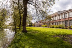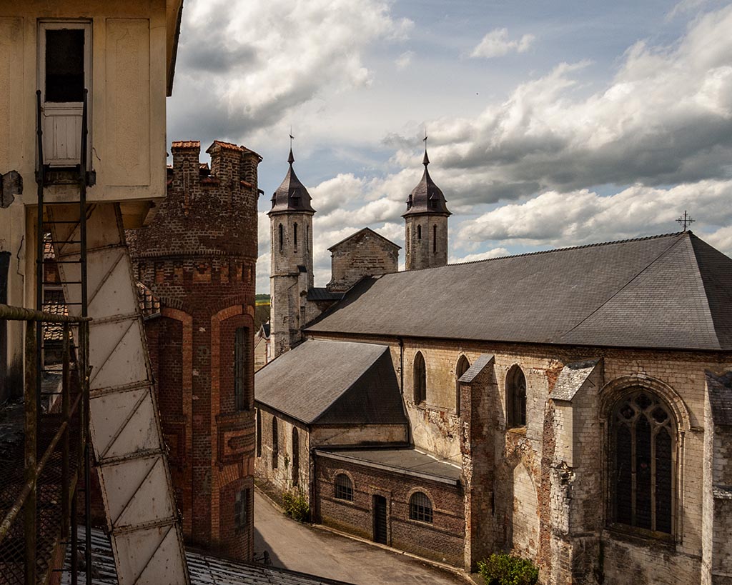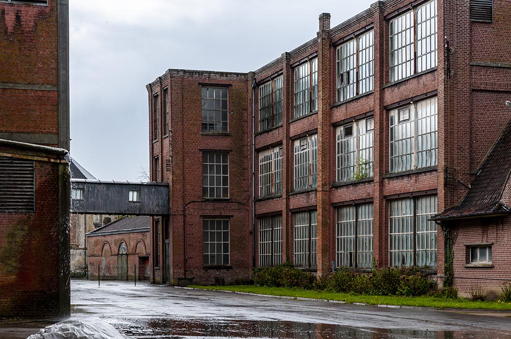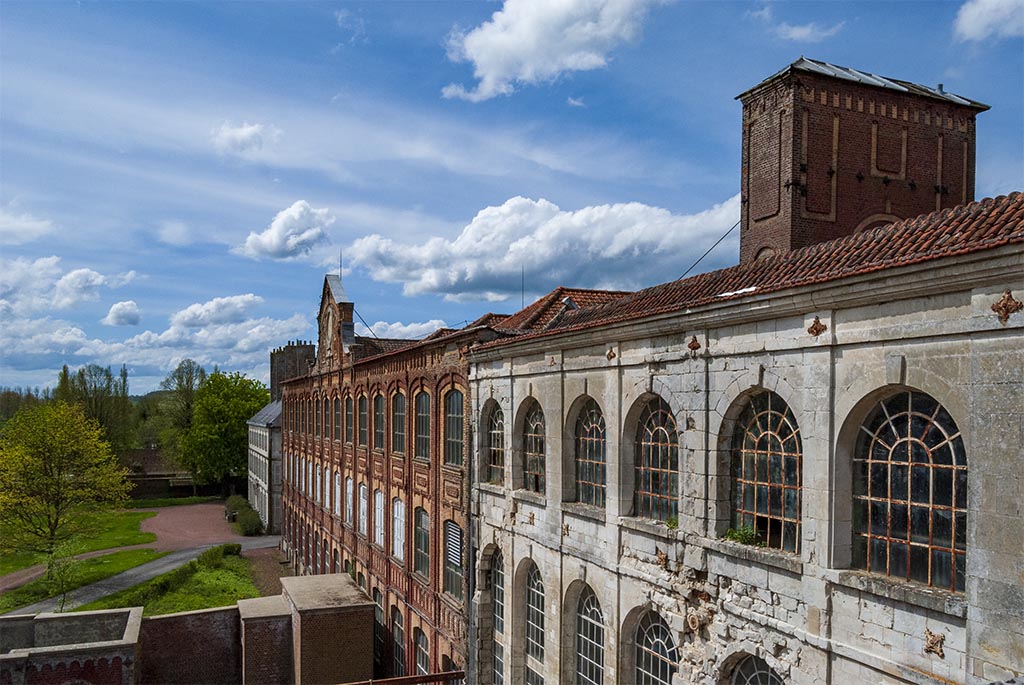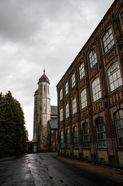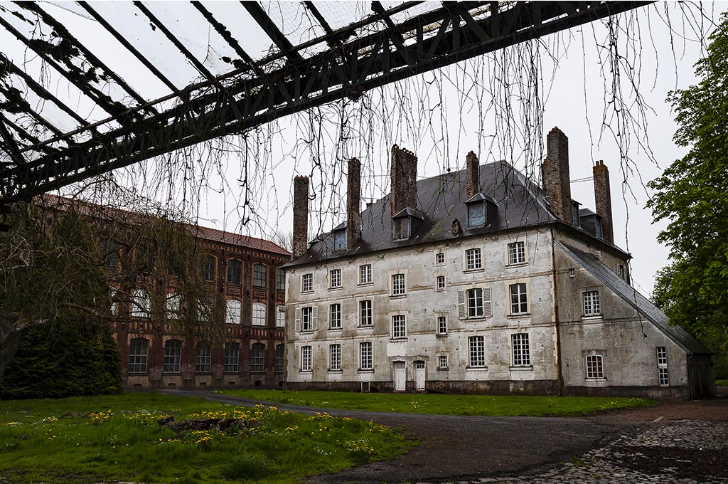 Quand on fait le tour des bâtiments pour rejoindre l’autre côté des ateliers, on est surpris par l’opposition entre les façades de devant et celles de derrière. La cour oppressante de l’usine laisse la place à un parc traversé par la Ternoise. La tonalité change. Le pigeonnier et un reste d’abbaye aux fenêtres cintrées adoucissent par leur couleur blanche la brutalité rouge de l’atelier plus récent. On perçoit vite que, de ce côté de l’usine, le travail s’efface.