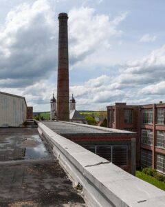 Au XIX° siècle, qui disait usine disait forcément cheminée. Corollaire de la machine à vapeur, la cheminée était présente dans toute industrie qui se respectait et intensifiait sa production. Son rôle ne se limitait pas à sa fonction technique, elle matérialisait aussi la puissance économique de l’entreprise. On la voulait haute et imposante. Sans atteindre la taille des mastodontes de Lille, Roubaix, Tourcoing, celle d’Auchy est suffisamment grande pour que du sol il soit difficile d’en photographier le sommet. Pour l’atteindre, il faudra que l’on monte sur un toit plateforme. Mais que vient faire la cheminée en compagnie d’une tour féodale qui semble l’observer et une église complètement dépassée par sa hauteur ?  .