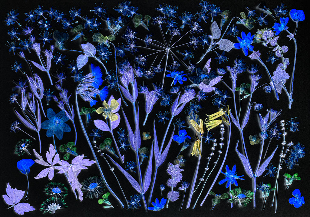La photographie présentée ici rassemble quelques fleurs sauvages, cueillies dans un sous-bois en mai 2020, juste à l’issue du premier confinement. Après plusieurs semaines de séchage, les plantes ont été disposées sur un fond blanc puis photographiées pour former un tableau floral. L’image obtenue a ensuite été déclinée en plusieurs versions, reflétant chacune notre relation au souvenir de cette journée. Pour traduire l’exaltation ressentie à ce moment de retour à la liberté, porteur de joie et de promesses nouvelles, on a donné à la scène l’illusion d’un feu d’artifice en bousculant la couleur des fleurs par un jeu approprié de calques et de modes de fusion.La version suivante marque l’inflexion du présent en un point où le passé s’annonce dans le futur qui arrive. Ici les passé, présent et futur se rejoignent et entr’ouvrent une porte vers un monde sans dimension temporelle, souvent caractéristique du noir et blanc. La dernière manipulation s’appuie sur un virage sépia et un flou de profondeur de champ pour signifier la progression du passé et l’avancée de l’oubli. L’accès donnant sur l’immuable s’est refermé sans qu’on puisse y pénétrer. Pénélope a de la matière à tisser et à réinventer.