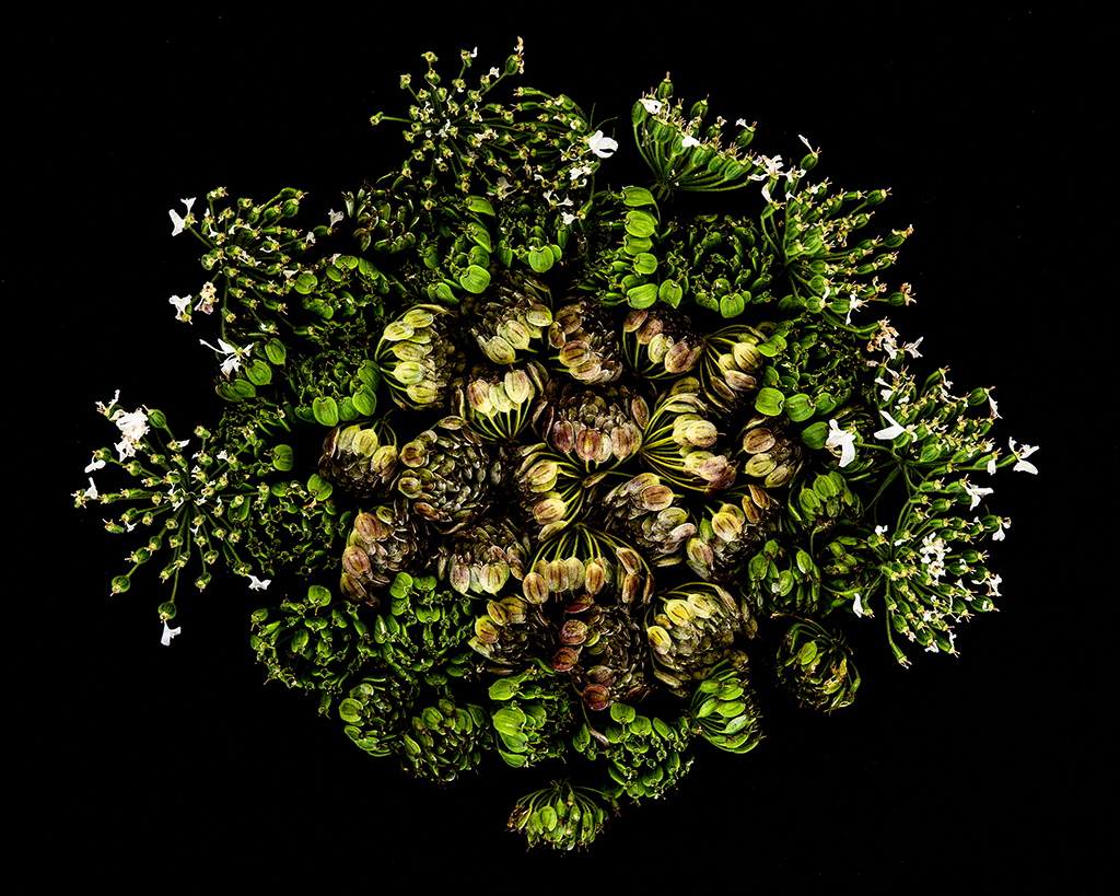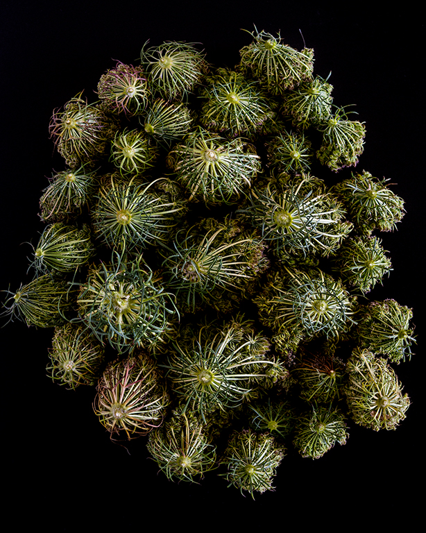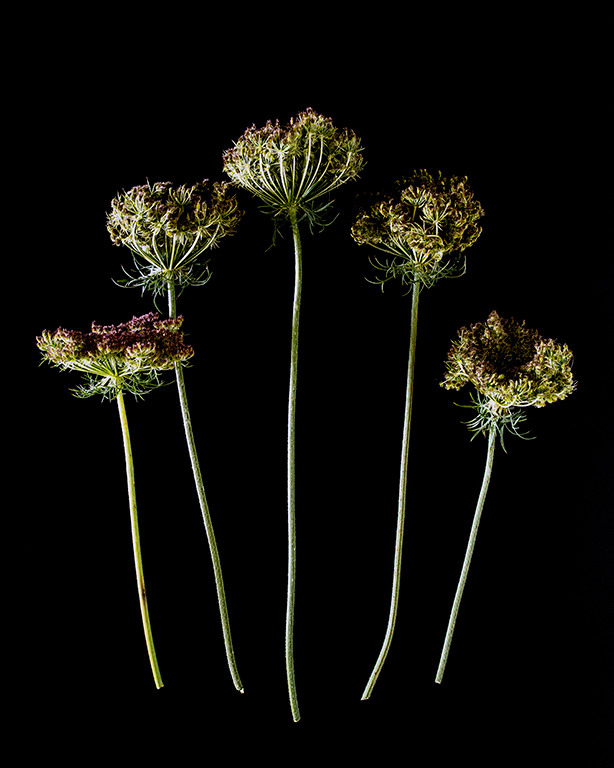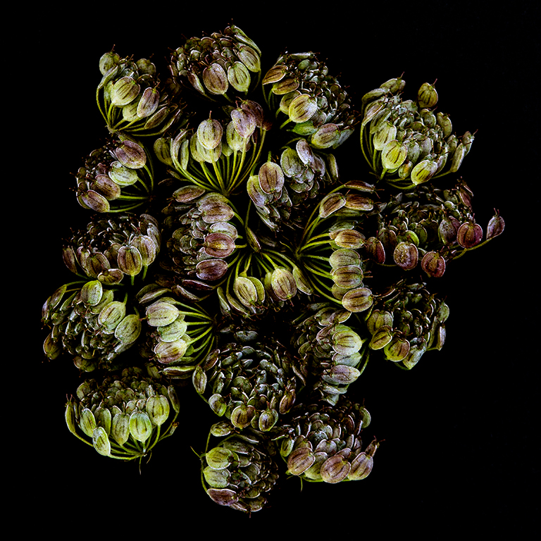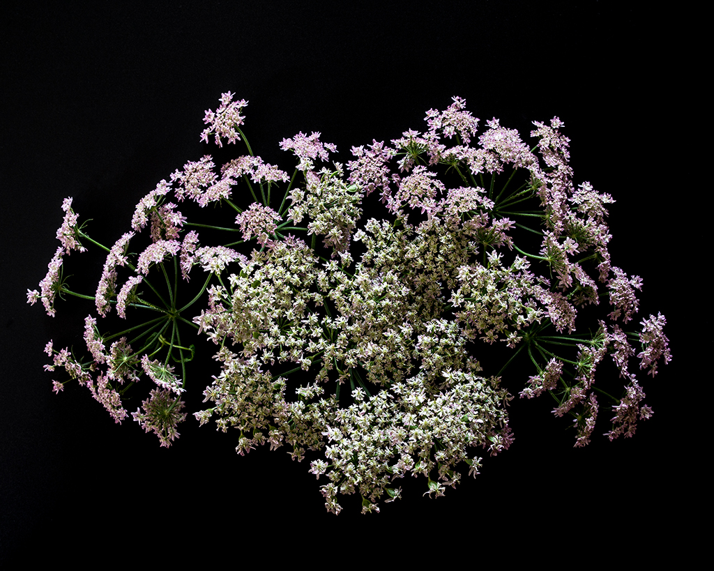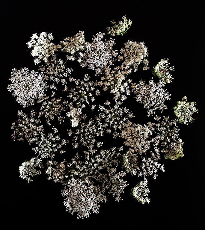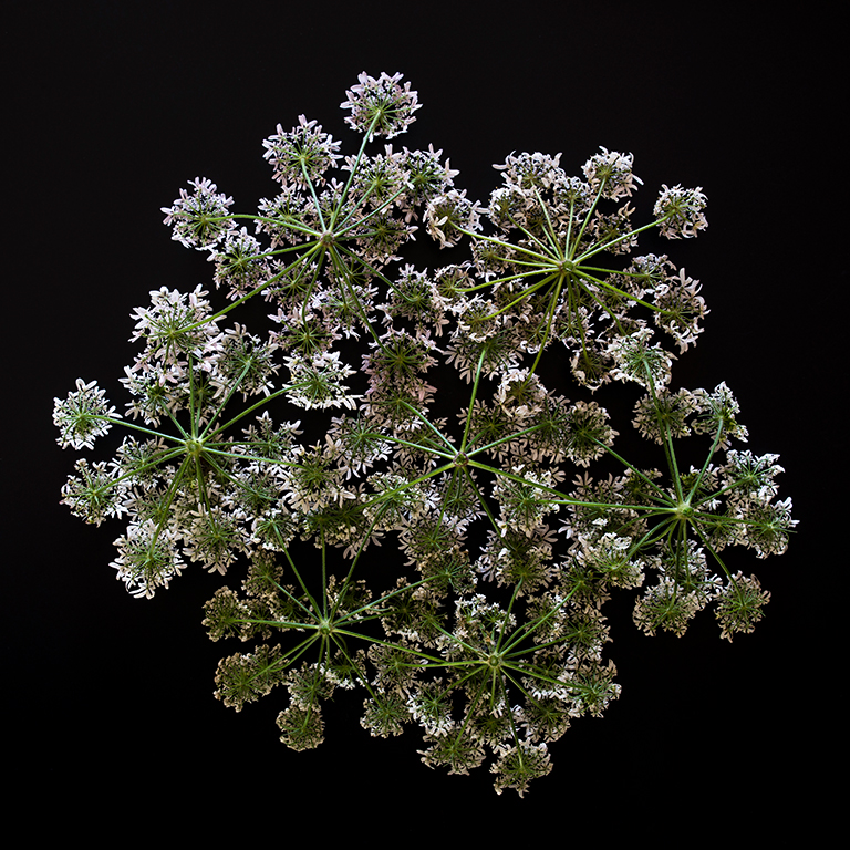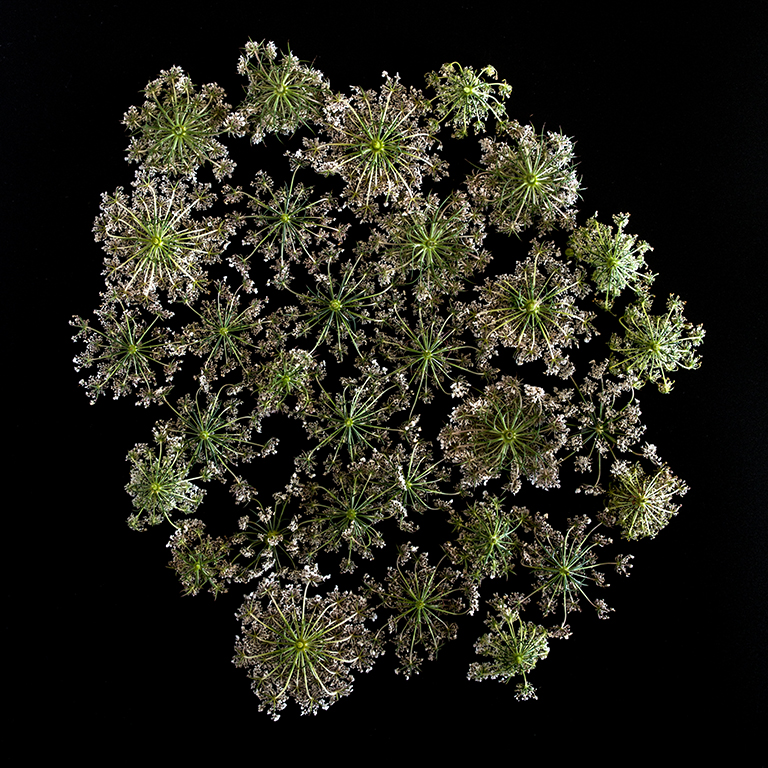 Les ombellifères ? Des plantes sauvages qui s’installent l’été sur le bord des petites routes et des chemins creux. Heracleum sphondylium et daucus carota ? Respectivement la grande berce et la carotte sauvage, les espèces les plus communes dans le Nord de France. En faire le portrait ? Oui mais ne voir dans la grande berce qu’une grande berce et qu’une carotte dans la carotte ? Ou bien imaginer autre chose et photographier par exemple un chandelier, un masque, un profil, un visage, une fractale, une vanité, une dentelle ….