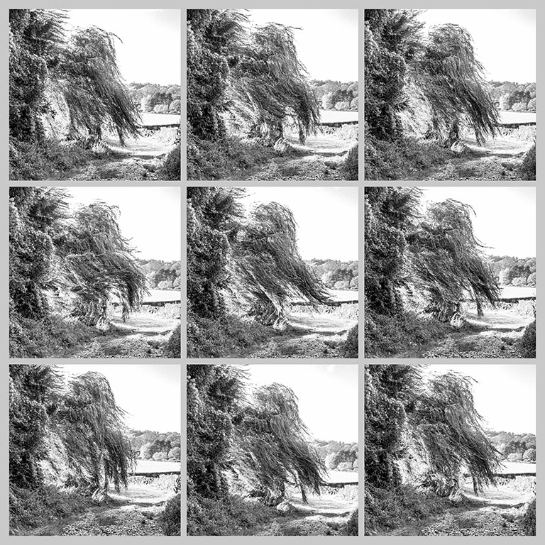 C’est l’histoire d’un grand saule perturbé par la tempête, luttant contre les assauts d’un diablotin hargneux que le vent avait camouflé dans ses branches. On a voulu saisir « sur le vif » le déroulé de cette vaine bataille dont personne n’est sorti gagnant, ni le saule, ni son tronc, ni ses branches, ni son esprit démoniaque, d’ailleurs volatilisé une fois le calme revenu. En l’absence de pied photographique, il était hasardeux de s’engager dans des expositions multiples. Pour cette raison, des clichés ont été pris en rafale pour séquencer le mouvement. On en trouvera ci-dessous deux aperçus.